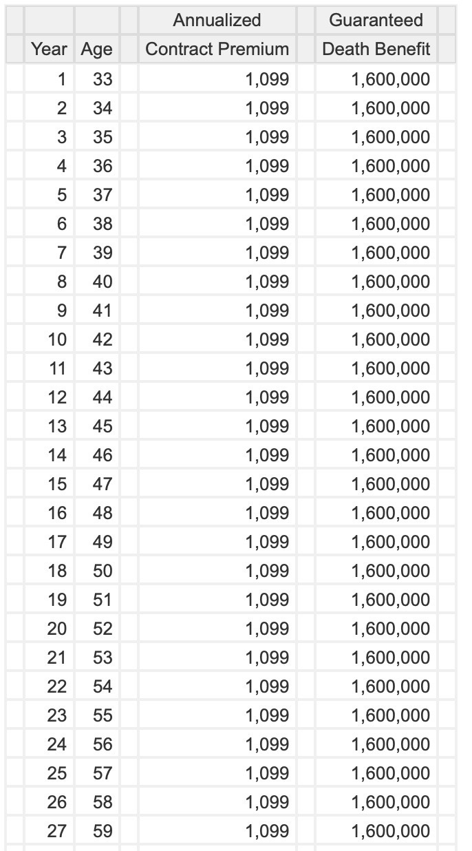 For a healthy 32 year old male, $1.6 million in coverage for a 30 year term policy would cost $1,099/year - or roughly $91.62/month. A female with the same situation would cost roughly $870/ year or $72.47 a month. (Women are generally healthier and live longer than men & are hence cheaper to insure)