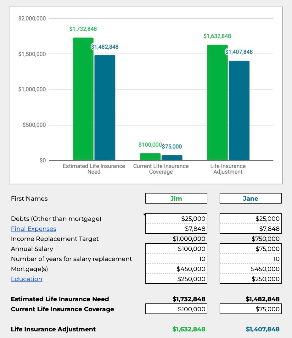 Because they have a small policy through work (1x Salary) we deduct that from the estimated life insurance need & that gives us the recommended life insurance adjustment.