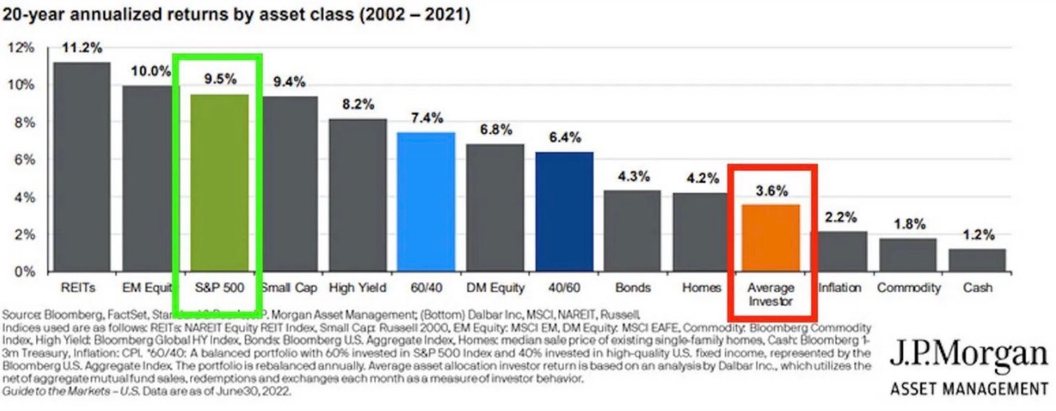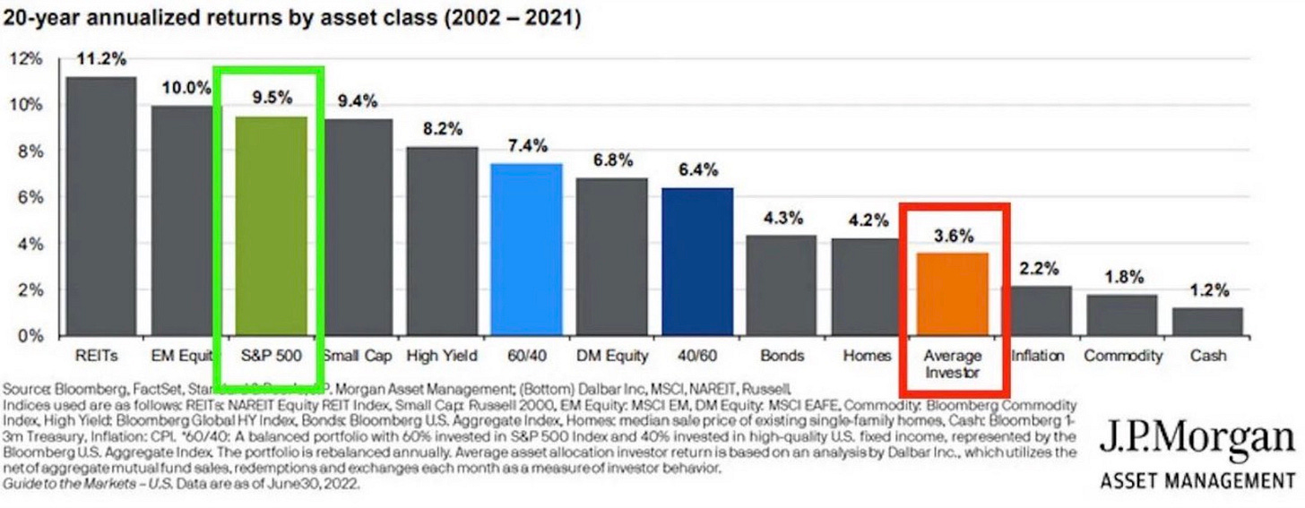This chart below from J.P Morgan shows an even bigger discrepancy from the Dalbar study!