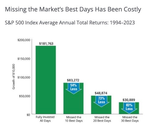 Did you know that missing just the 10 best trading days over a 20-year period can reduce your total returns by nearly 50%? That’s why staying invested, even during downturns, is essential.