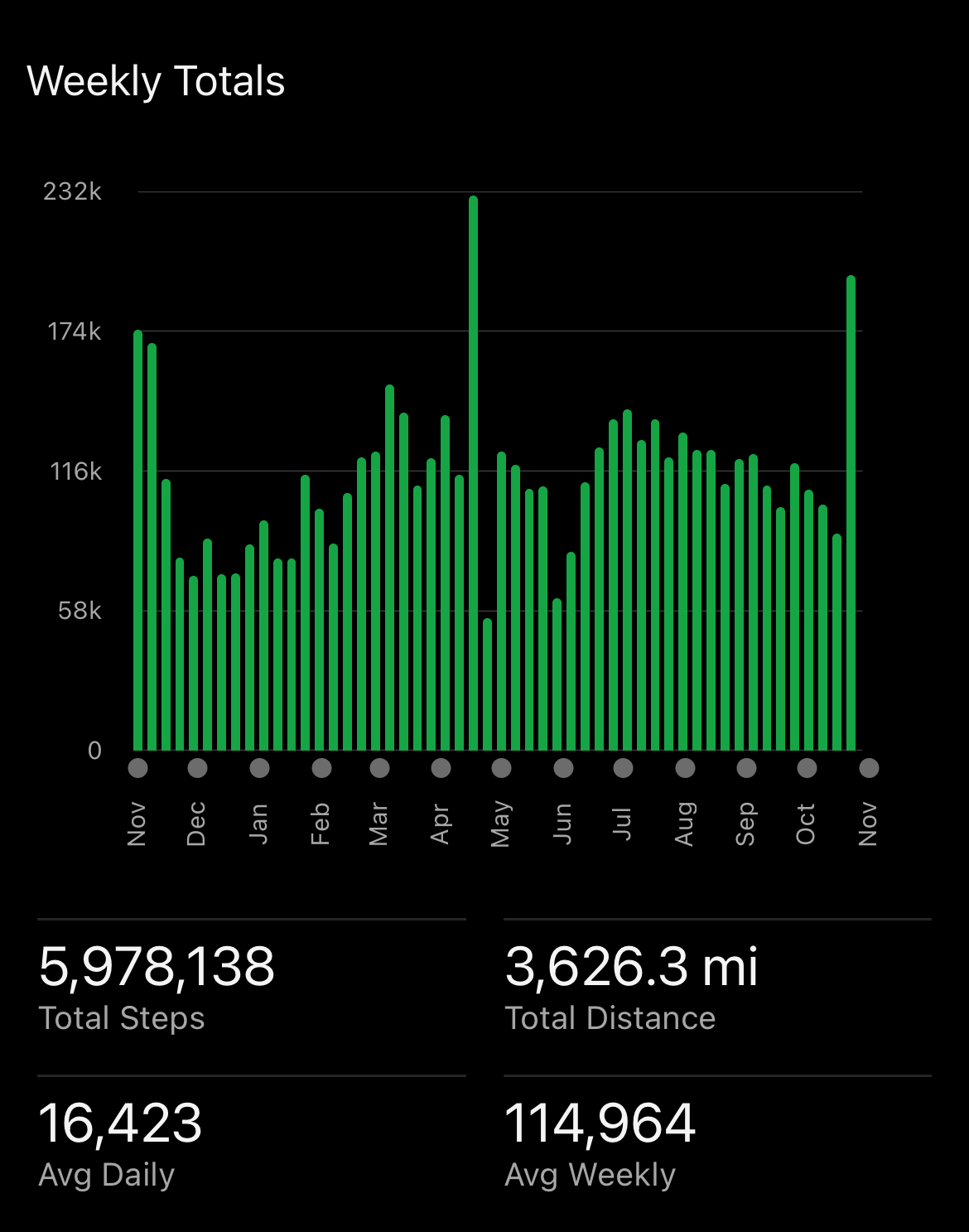 A year ago I told myself I was going to stick to 15,000 per day - without the daily tracking, there is little chance I’d have even come close. Life gets in the way, let the tools around you ensure you don’t forget about your commitments to your goals.