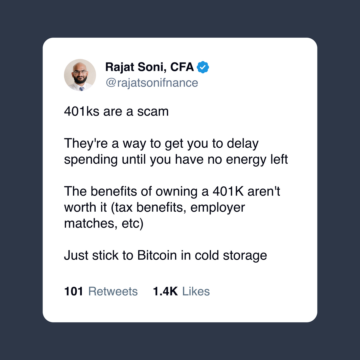 A thread explaining compound interest and matching provisions gets 10 likes. A thread calling 401(k)s a scam gets 1,400+ likes, 142,000+ views, and lands the influencer a podcast interview.
