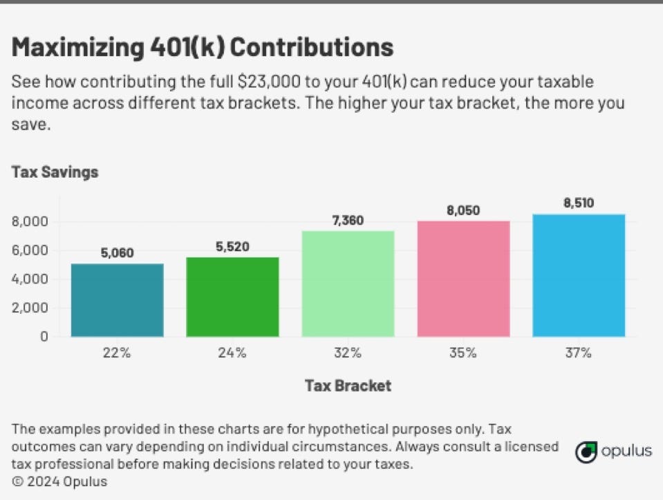 If you want to save on taxes while building your retirement, your 401k should be your first stop. Max out the $23,000 contribution limit (for 2024), and grab the employer match. The best money is free money. Consistency here is key.
